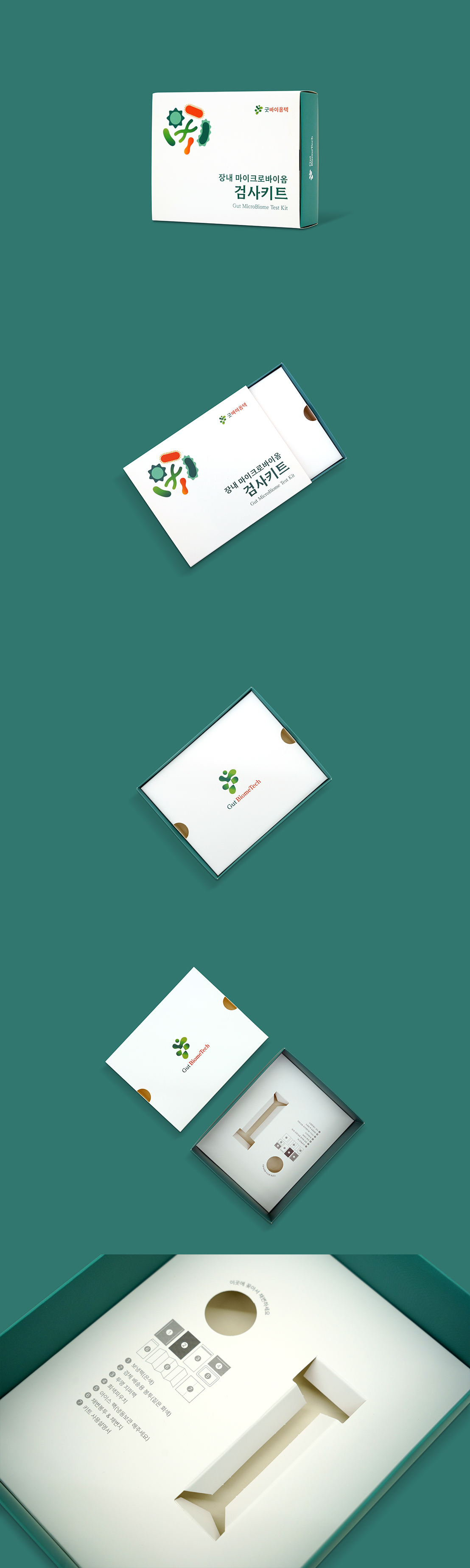 충북대학교(굿바이옴텍) 검사키트 제작 박스형태 S형 종이원단 로얄아이보리 350g 인쇄사양 원색4도, 무광코팅 사이즈 195*61*153 컨셉 실험용 샘플 채취를 위한 키트입니다. 장내 미생물을 일러스트로 표현해 키트 용도를 쉽게 알아볼 수 있도록 디자인 하였고, 제품설명서 및 얇은 제품을 담는 단상자를 상단부에, 검사 용기는 하단부에 끼워넣는 구조로 제작하였습니다. 문의포함